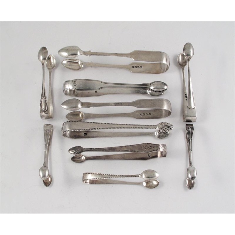 Sugar tongs: a pair of George III bright-cut tongs, initialled, by Susanna Barker, London c.1780 and nine other assorted pairs of tongs, 9oz. (10)