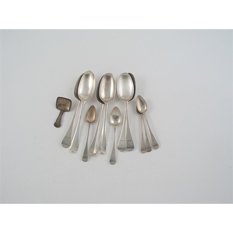 Mixed flatware: Six antique rattail tablespoons, four Aberdeen-made teaspoons, by Jhn Leslie, a Dundee teaspoon by William Constable, and a caddy spoon with an Hourglass stem, 12oz. (12)