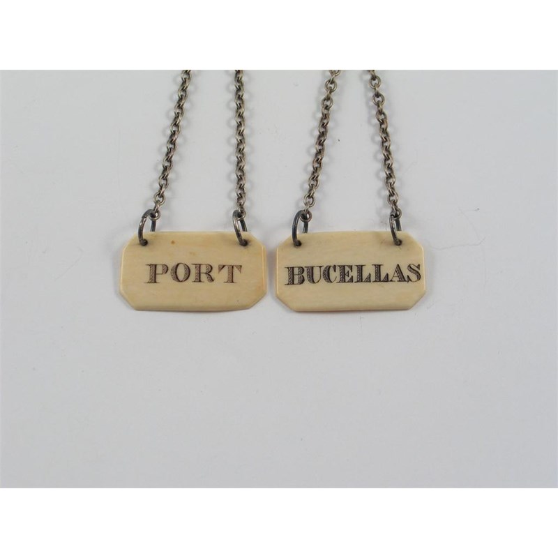 A pair of 19th century ivory wine labels, canted oblong "PORT" & "BUCELLAS".