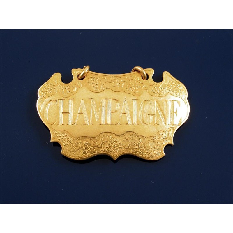 A rare George II 'Pinchbeck' wine label, of escutcheon form incised "CHAMPAIGNE" between borders of fruiting vines, the reverse stamped with the initials "CP" for Christopher Pinchbeck the Younger, 1745-50.
