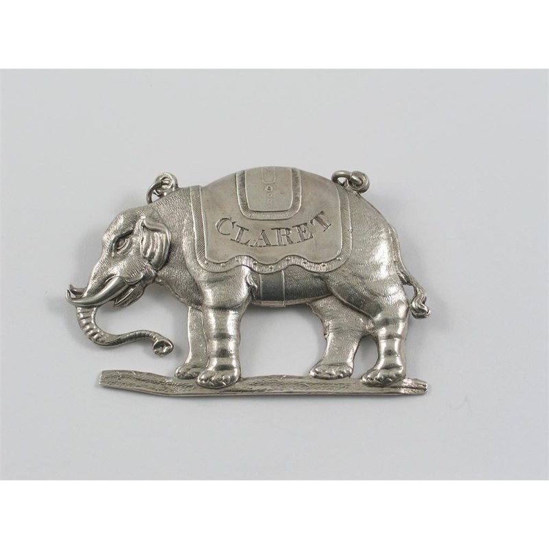 A rare George III wine label, in the form of an Indian elephant with a drape over it's back, incised "CLARET", by Edward Farrell, London 1815.