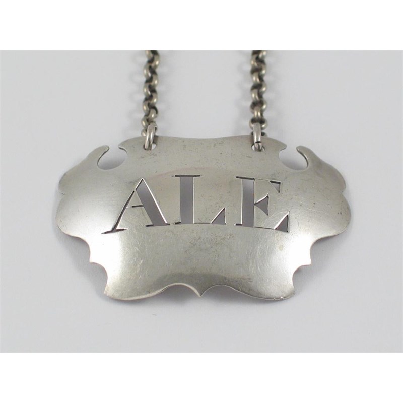 A George II/III escutcheon wine label, pierced "ALE", by Sandilands Drinkwater, London c.1760 (maker's mark & lion passant only.
