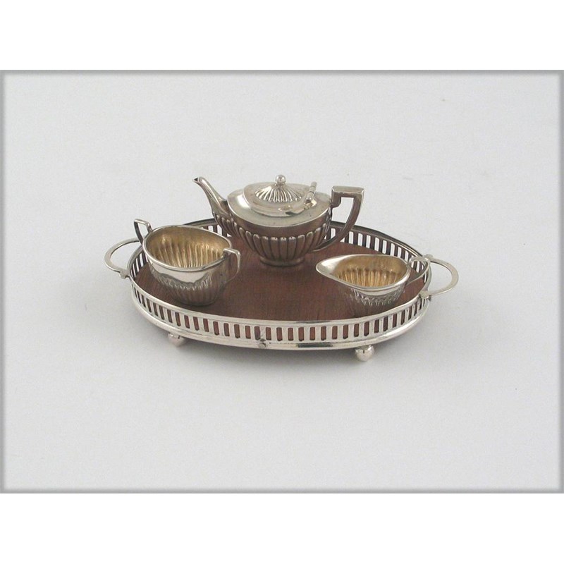 An Edwardian miniature or toy cream jug and sugar bowl, with fluting and a mounted wooden tray, all by C. Saunders & F. Shepherd, Birmingham 1901, together with a teapot by Levi & Salaman, Birmingham 1910, the tray 4.1in (10.25cm) wide. (4)