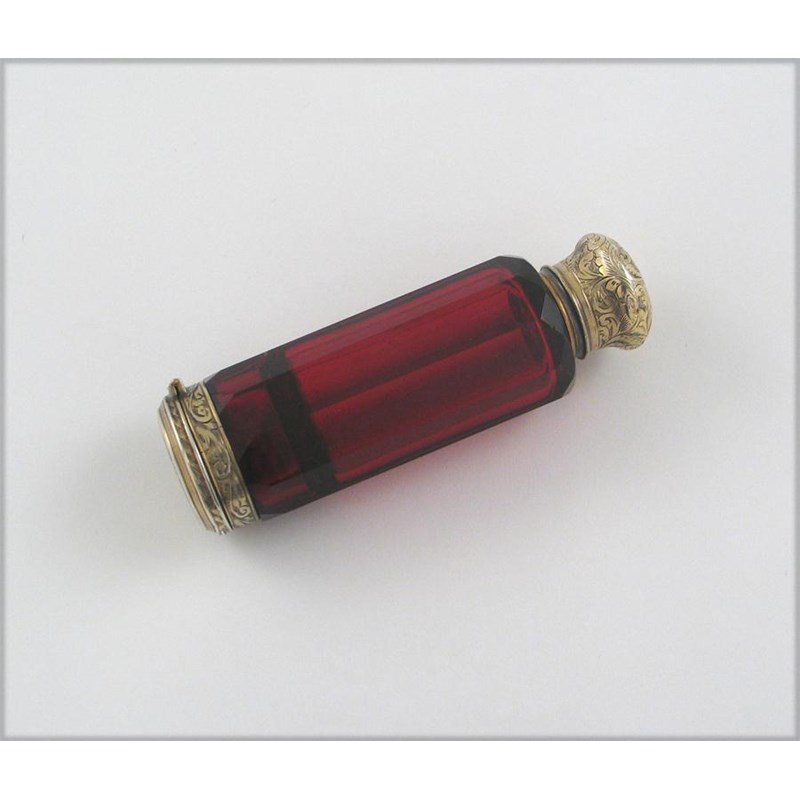 A Victorian silvergilt-mounted red glass scent bottle cum vinaigrette, with engraved mounts, unmarked, c.1870, 3.6in (9.2cm) long.