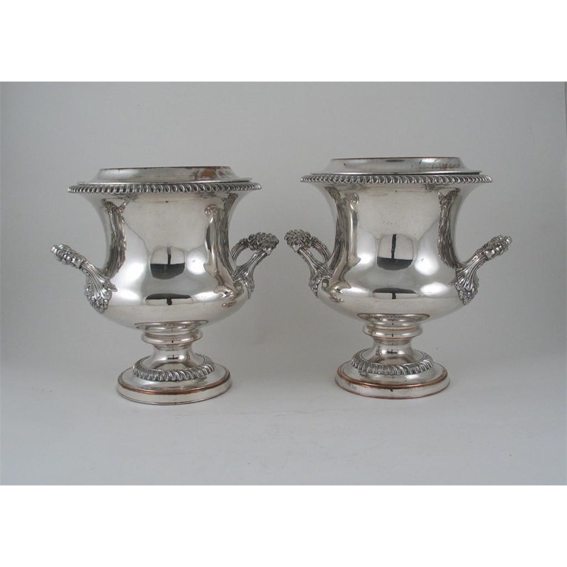 A pair of Old Sheffield plated wine coolers, of baluster form with ornate handles, gadrooned borders, complete with liners and collars, c.1840, 9.5in (24.2cm) high. (2)
