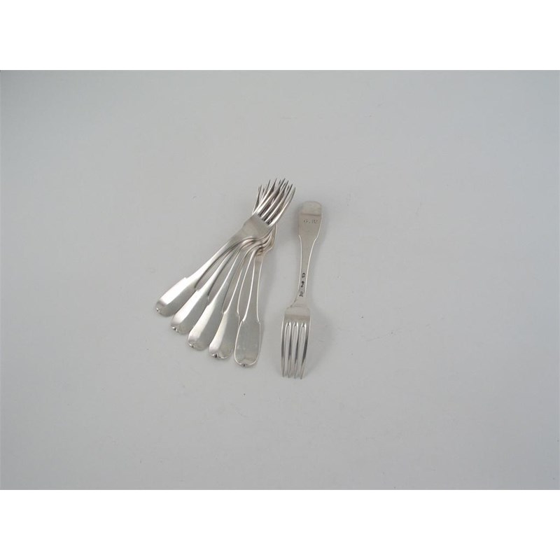 Six 18th century French tableforks, with fiddle stems no shoulders, initialled "G.RY.", mixed maker's, Chalon & Macon (Dijon), c.1750, 17oz. (6)