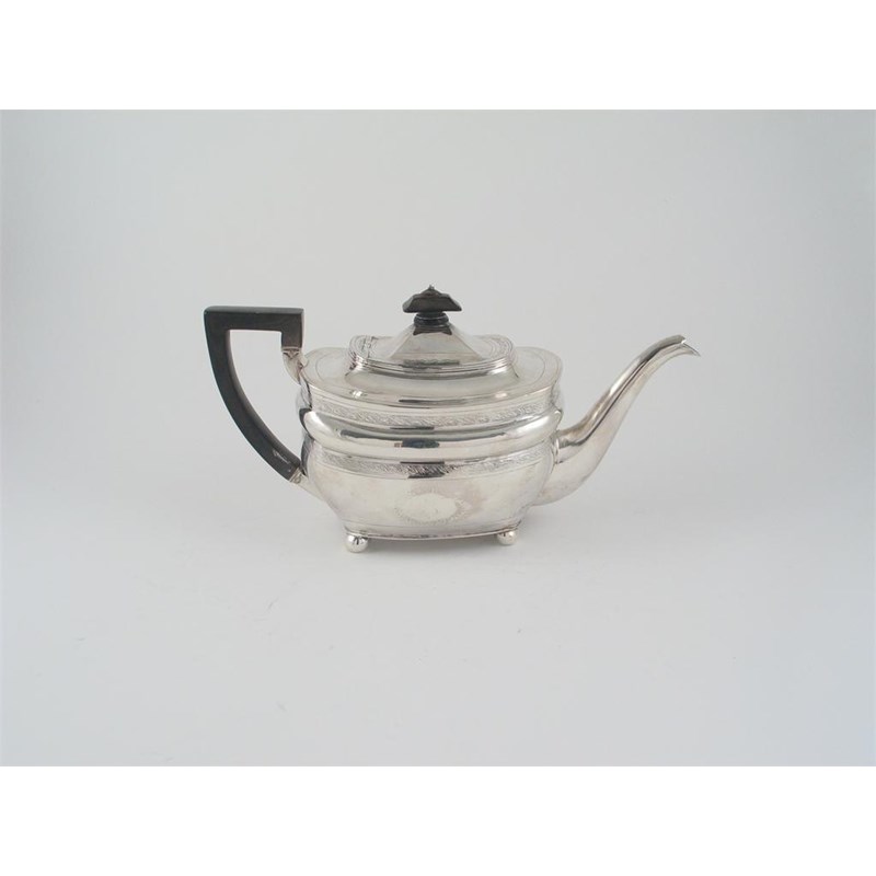 A George III teapot on ball feet, with two engraved floral friezes, by Alice & George Burrow, London 1805, 15oz.