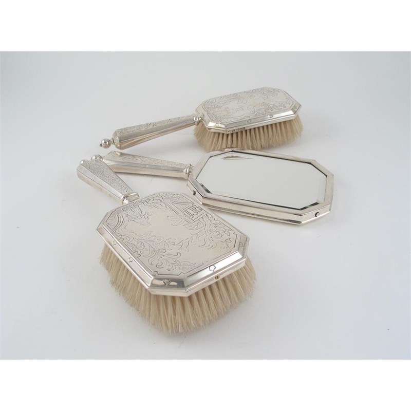 A modern matched, hand mirror and two hair brushes, with chased, chinoiserie decoration and ball finials, by D & J. Welby, London 1915/1923. (3)