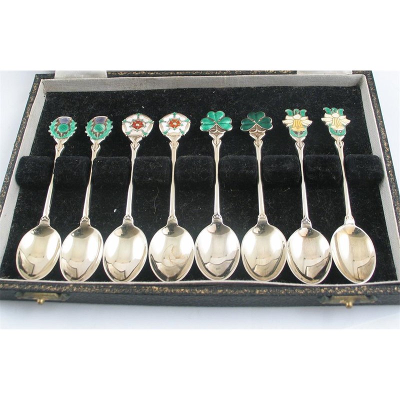 A cased set of eight modern silvergilt coffee spoons, with enamelled terminals representing England, Ireland, Scotland & Wales (two Tudor roses, two shamrock, two thistles and two daffodils), by Turner & Simpson, Birmingham 1949.