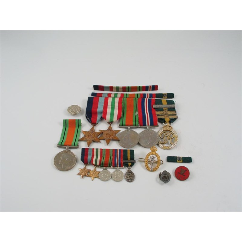 World War II, a group of five medals, reputed to have been awarded to Major F. E. Moules, Signals Regiment: 1939-45 and Italy Stars, Defence and War Medals, and Efficiency Decoration, 3 bars, Geo. VI, E II, and Territorial, mounted for wearing; dress miniatures; various badges and separate WW I War Medal (name erased) and WW II Defence Medal. Very fine.