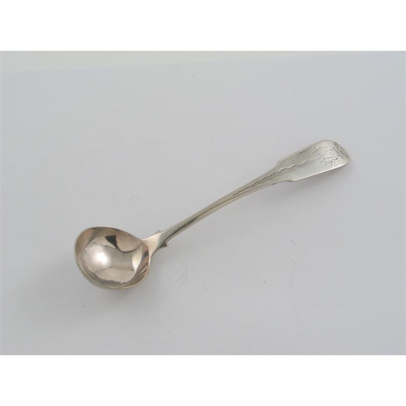 A 19th century unascribed small ladle, fiddle pattern, engraved with a serpent, below a crest and the initials "GB", maker "AFC" and an unidentified town mark, probably early 19th century, 5.5in (14cm) long, 0.7oz.`