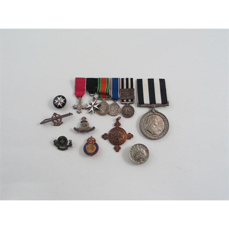 Miniature group of five Orders and Medals: O.B.E. (Civil), Order of St. John, 1939-45 Defence Medal, Coronation Medal 1937, Order of St. John, Service Medal, with 4 5-Year bars, mounted for wearing, extremely fine; Order of St. John, Service Medal (23340 A/Sis A. Nickless. No. 7 Dis. S.J.A.B. 1941), mint state; gold mounted R.A.M.C 'sweetheart' brooch, St. John buttons, etc (3), others (3) including a silver and enamel Royal Artillery 'sweetheart' brooch.