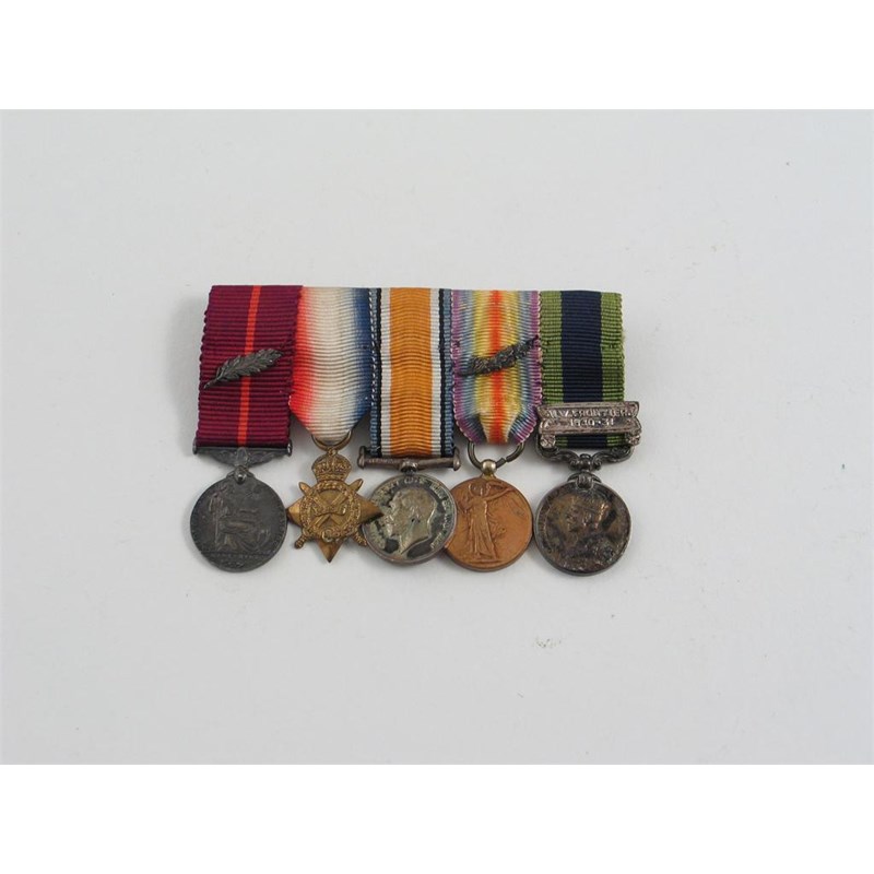 An Empire Gallantry Medal miniature group of five: Empire Gallantry Medal, G.V.R., Military, with laurel branch, 1914-15 Star, British War and Victory Medals, latter with oak leaves for Mention in Despatches, India General Service medal, bar N W Frontier, 1930-31, mounted for wearing. Very fine. .