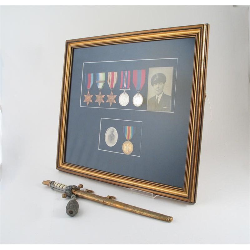 World War II, a Naval Group of five awarded to Chief Petty Officer Fred Kitching; 1939-45, Atlantic (with France and Germany clasp), and Africa Stars, War Medal; Imperial Service Medal, E II (1977); and Great War, British War Medal, to his father (26364 Pt. F. Kitching. D. of Corn. L.I.), the medals handsomely mounted and framed for display with photographs of the recipients; also with box and case of issue, dress ribbons, Chancery letter, certificates and ship photograph; together with Third Reich, 2nd Model Navy Dagger, maker Carl Eickhorn (stamped squirrel holding sword), off-white celluloid-over-wood grip with eagle/swastika pommel and fouled anchor crossguard, original (though frayed) aluminum portepee in correct reef knot tie, etched plated blade, brass lightning bolt pattern scabbard, in original uncleaned condition. (lot)