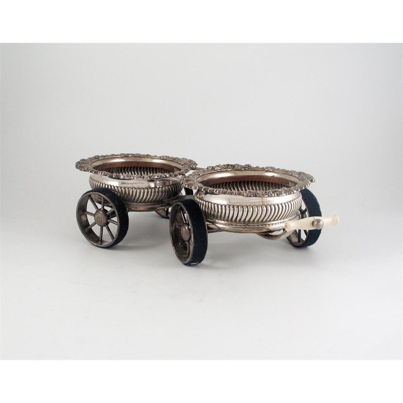 An Old Sheffield plated double coaster trolley, with four spoked wheels (the front two articulated), turned wooden bases with inset bosses, borders of foliage and gadrooning and an ivory handle, c.1840, 16.4in (41.7cm) long.