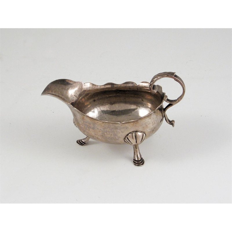 A George II cream boat, with a wavy rim, a flying scroll handle and three stepped feet, scratched "EU" underneath, by William Shaw & William Priest, London 1757, 5in (12.5cm) long, 3oz.