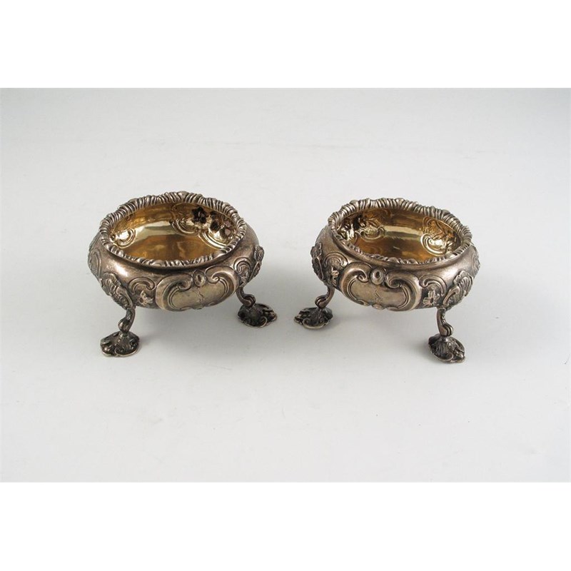 A pair of Victorian embossed circular salts, on three cast feet with shaped, gadrooned rims and gilt interiors, by Hyam Hyams, London 1846, 3.4in (8.5cm) diameter, 7.25oz. (2)