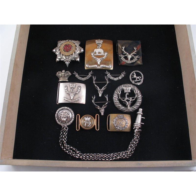 Regimental Interest: a quantity of assorted, badges, buckles, etc including: Seaforth Highlanders i/ a silver mounted brass belt plate by Kirkwood, Edinburgh ii/ a cast stag's head brooch by Kirkwood iii/ two motto brooches, unmarked iv) a plated badge on tartan v) a cast stag's head brooch unmarked Seaforth Highlanders of Canada i) a large Victorian hallmarked plaid brooch, by Kirkwood, Edinburgh 1882 ii) a Victorian hallmarked belt buckle, by Jennens & Co., Birmingham 1878 iii) a brass two-piece, mounted buckle '72' Royal Engineers i) a mounted brass belt buckle Assorted i) a third regt. Duke of Lancaster's own badge with enamel, a military whistle and boss, unmarked, and other sundries (some plated)
