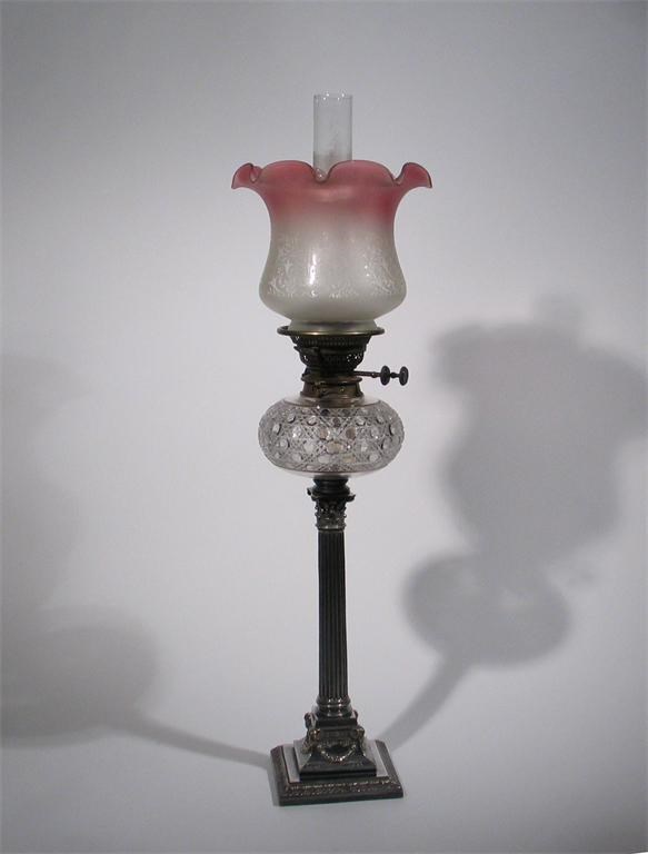 A Victorian plated oil lamp, with a fluted column, decorated with ram's masks, a cut glass bowl, a coloured glass shade and a chimney, c.1890, 29.75in (75.5cm) high, overall.