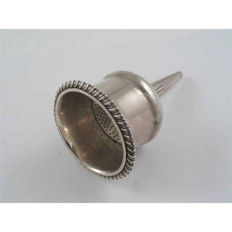 A George IV campana shaped wine funnel, with a gadrooned border, shell tang and muslin ring, crested, by R. Emes & E. Barnard, London 1826, 5.8in (15cm) high, 5.25oz.