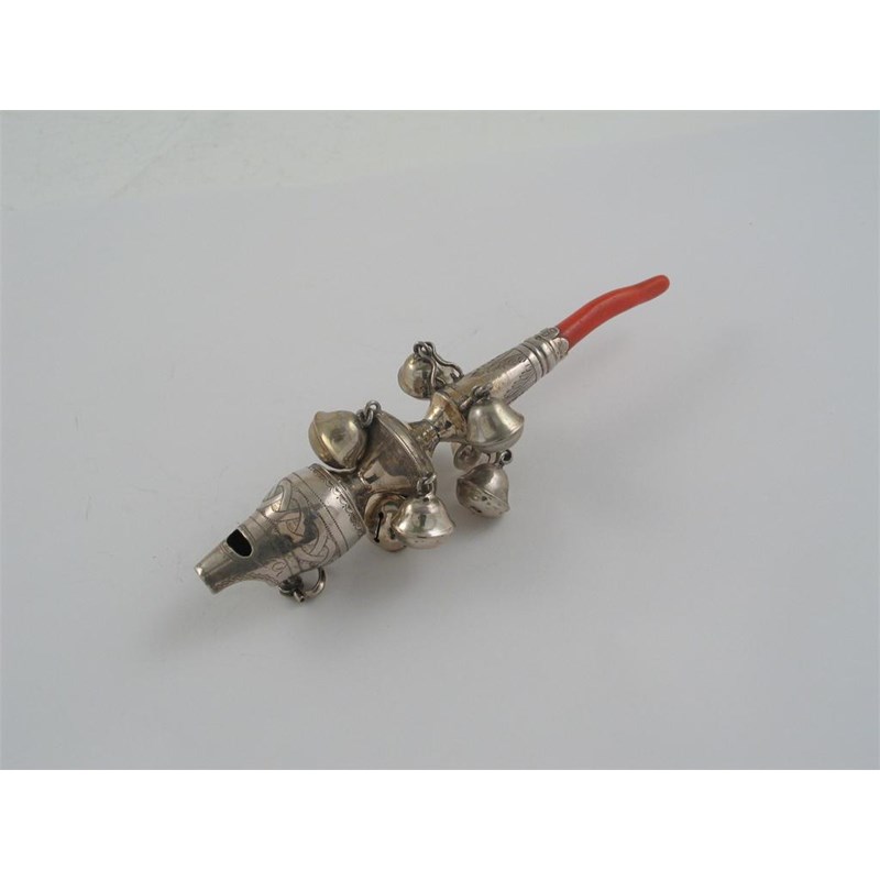 A George III engraved, child's rattle, of baluster form with whistle terminal, coral teether and eight bells arranged in two tiers, by James Beattie, London 1804, 5.75in (14.6cm) long.