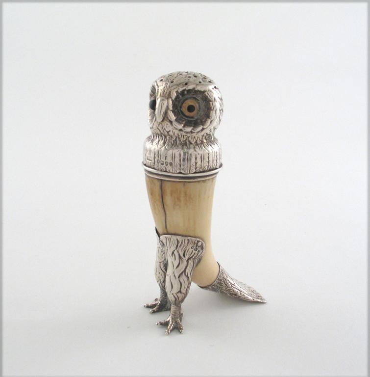 A Victorian novelty condiment, in the form of a standing owl with an ivory body and a pull-off head with glass eyes, by W.F. Wright, London 1877, 5.5in (14cm).