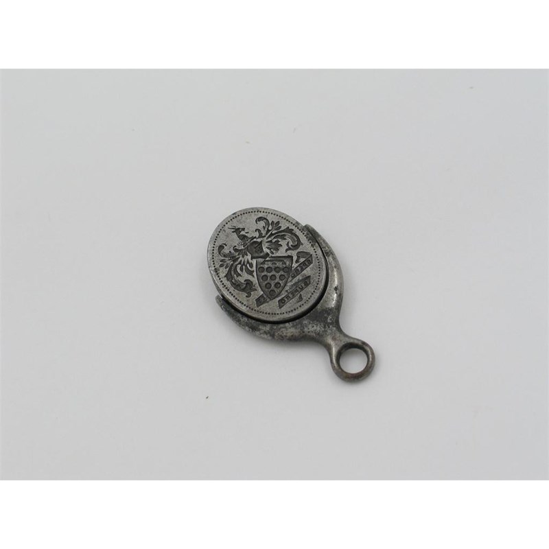 A Victorian steel fob seal, with a swivel matrix one side monogrammed and one side with a coat of arms and motto "SPERO ET SUPERO" [intaglio], 1.6in (4cm) high.