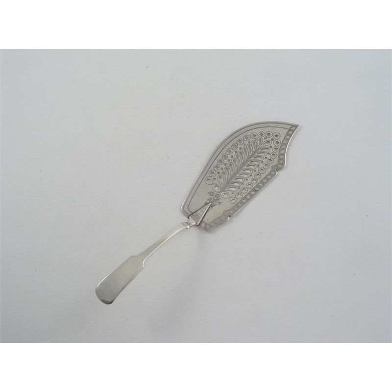 A William IV bright engraved fiddle fish slice, pierced with mullets, pellets and scrolls, by Joseph Wilmore, Birmingham 1835, 3.25oz.