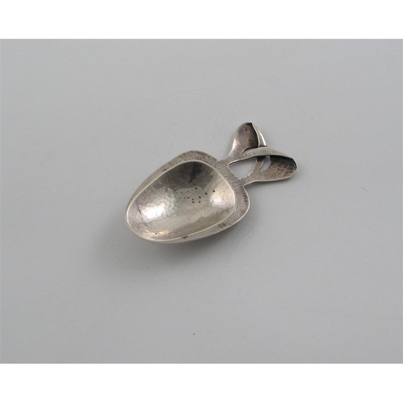 An Edwardian caddy scoop, with an entwined, openwork stem and shallow bowl with a hammered finish, by Liberty & Co, Birmingham 1907.