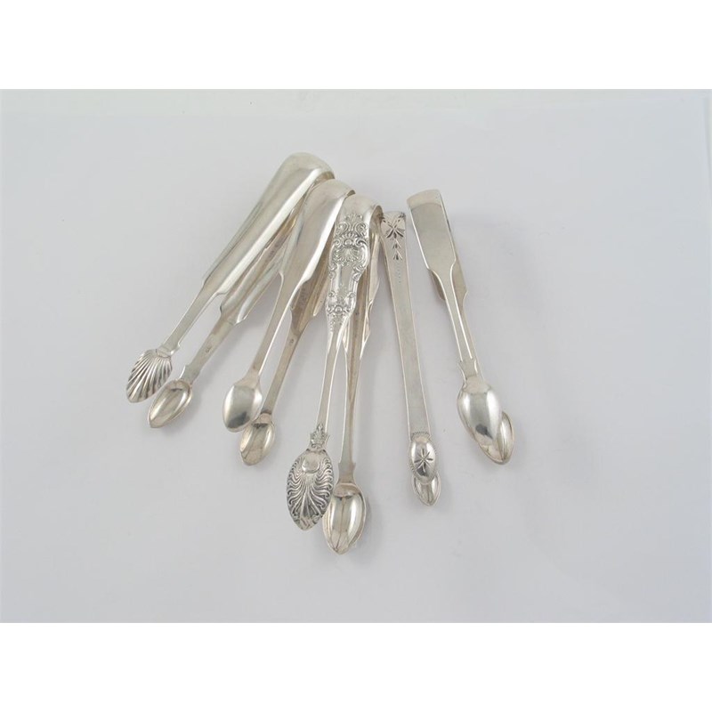 Five assorted pairs of sugar tongs: a bright cut pair, by Langlands & Robertson, Newcastle c.1780, a fiddle pair, by Thomas Sewell, Newcastle 1873, an Edinburgh oar pattern pair, 1813, a Queens pattern pair, by Peter Markin, Glasgow 1854, and a Scottish provincial pair, by Robert Keay II, Perth c.1840 (all initialled except the Newcastle pair), 6.5oz. (5)