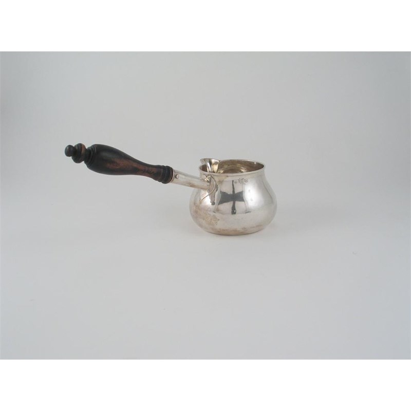 A George I Irish brandy saucepan, of bellied form with a flat base scratched "11oz O dwt" and a turned wooden handle, by Henry Daniel, Dublin 1723, 4.25in (10.8cm) diameter, 10.5oz.