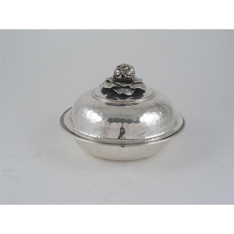 Royal Association: an early 20th century Danish vegetable tureen and cover, with a hammered finish and a cabbage finial engraved with the Royal Crown & Cypher of Queen Alexandra, by Michelsen, Copenhagan 1904, 8in (20.5cm) diameter, 34oz.