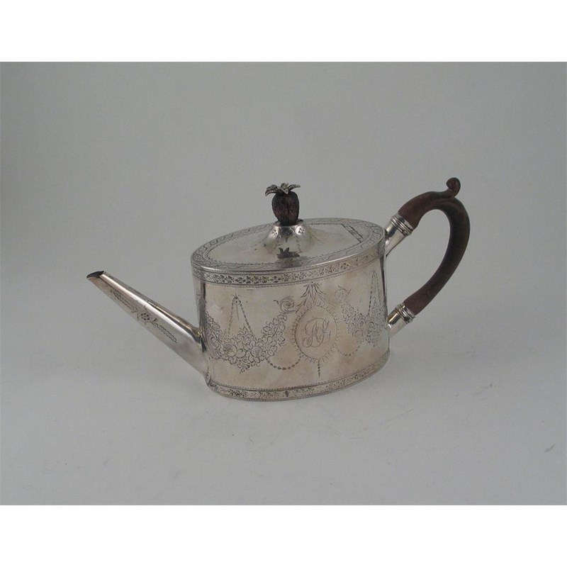 A George III bright-cut oval teapot with a straight spout, and mounted wooden pineapple finial, initialled and inscribed on the base, "Made at the Silver Lyon Foster Lane, London", by Thomas Daniel, London 1785, 12oz.