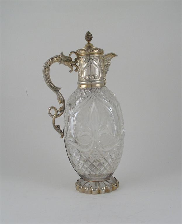 A late Victorian silvergilt mounted cut glass claret jug, on a polyfoil foot with a dolphin scroll handle and embossed mount, by Mappin Bros, London 1899, 13.7in (35cm) high.