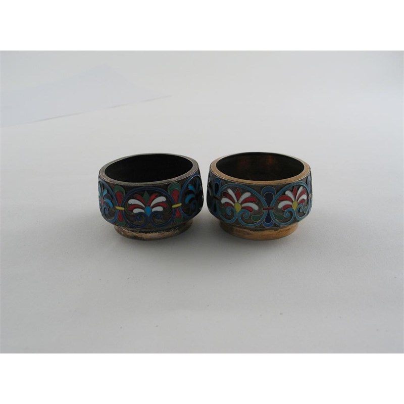 A pair of late 19th century Russian silvergilt and cloisonne enamelled salts, decorated around the sides with multicoloured scrolls and anthemions, by A.B. Lyubavin (with state marks for 1896-1908), 2.2in (5.5cm) diameter, 3.25oz. (2)