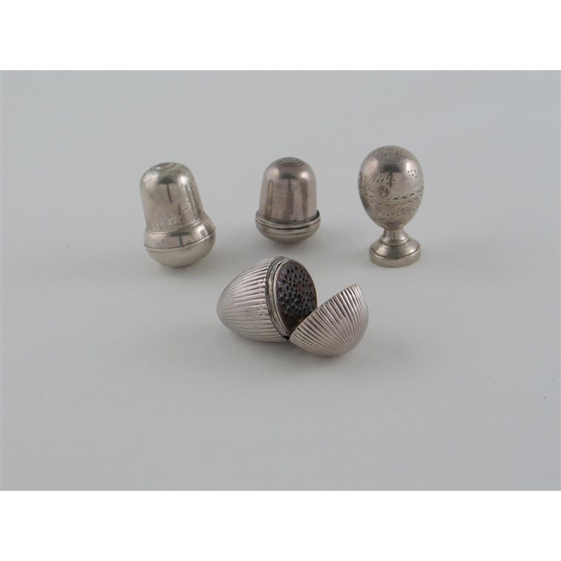 Four nutmeg graters: a bright-engraved oviform example on a pedestal foot with lift-out grater and gilt interior, unmarked c.1790, a plain acorn example with a screw cover, and base and a blued steel grater, unmarked c.1780, another acorn, (lacking grater) and a reeded egg type with hinged cover and hinged grater, also unmarked, c.1800. (4)
