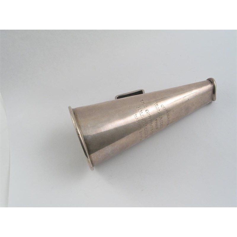 A modern Scottish model of a ship's megaphone, inscribed "Commander W.M. James RN. from the Gunroom Officers, H.M.S Queen Mary March 15th 1916", by Mackay & Chisholm, Edinburgh 1915, 4.5in (11.5cm) long, 3oz.