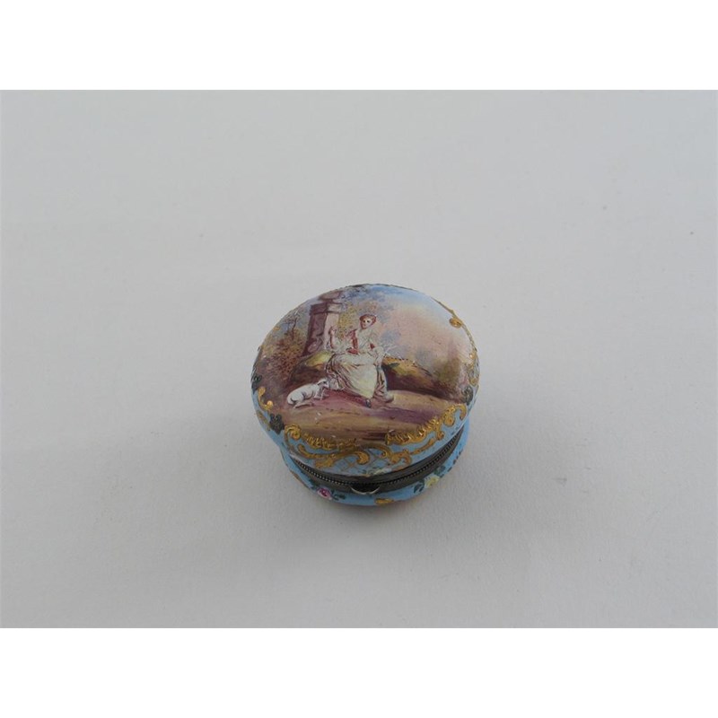 A late 19th century Austro Hungarian enamelled bon bon box, with a hinged cover, painted figures and flowers, heightened by gilding, the interior with painted architectural scenes, by Herman Boehm, Vienna, 2nd half of the 19th century, 2in (5cm) diameter.