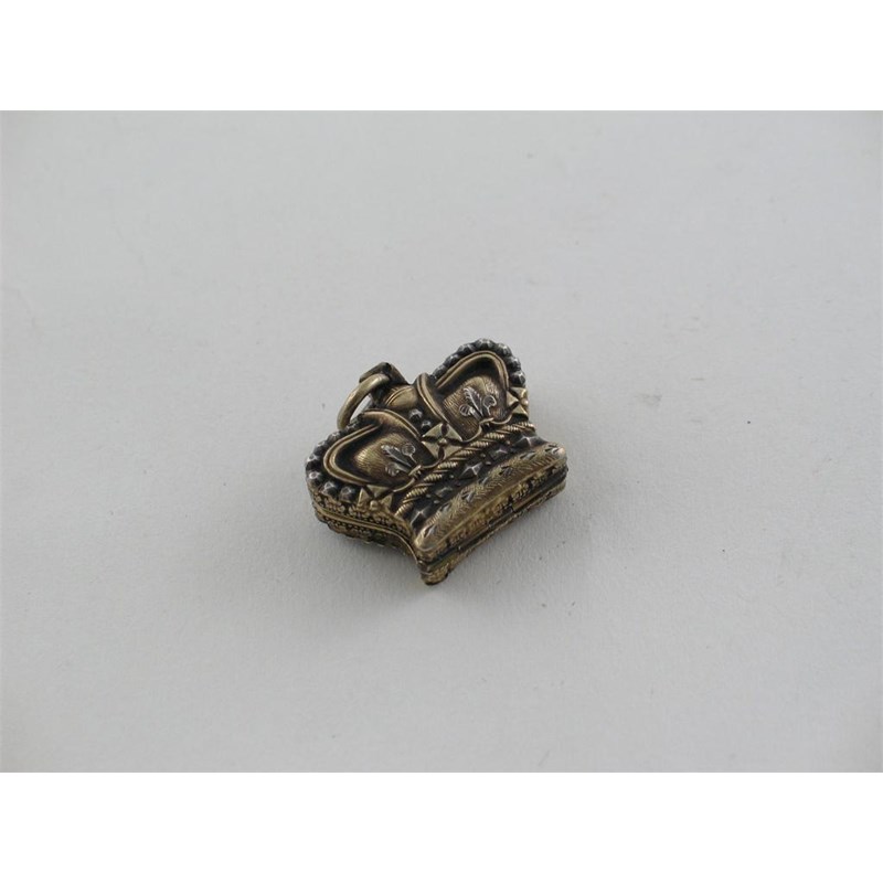 A rare George IV parcelgilt vinaigrette, in the form of the Royal crown, stamped in relief and faceted to simulate jewelling, the grille pierced with a vase of flowers and scrolls, by Joseph Wilmore, Birmingham 1820 (contained in a red Morocco leather case), 1.15in (2.15cm) wide. *Probably made to commemorate the Coronation of King George IV.