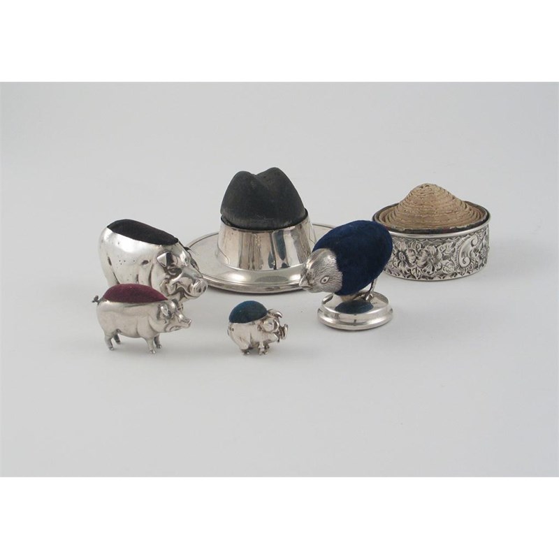 Pin cushions: three assorted pigs, a chick, a 'stetson' hat pin cushion and a mounted 'Pyramid' pin cushion, mixed maker's and dates. (6)