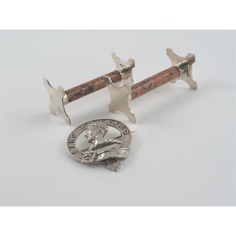 A pair of Scottish mounted pink granite knife rests, by W. Dunningham & Co, and a clan badge "GANG FORWARD" maker "JAMIESON ABERDEEN". (3)
