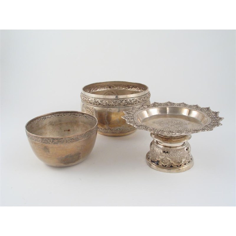 An Eastern tazza, on a chased domed foot, with a pierced border and two plated Burmese rice bowls, the former 6.5in (16.5cm) diameter. (3)