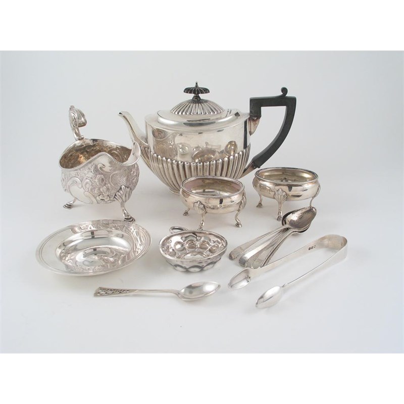 A mixed lot: a pair of George III oval salts 1780, a later embossed sauceboat 1787, a small French wine taster, an 'Armada' dish, two pepperettes, six teaspoons, a pair of sugar tongs, and a part-fluted teapot, 40oz. (lot)
