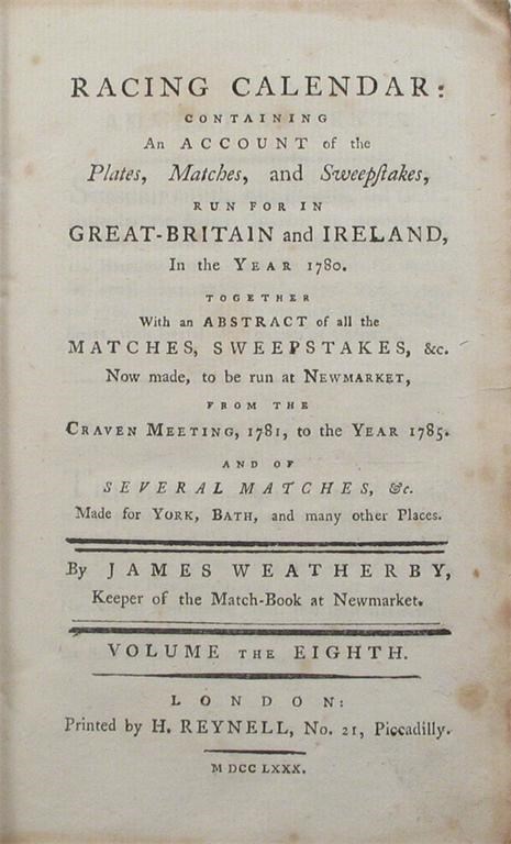 A bound, Racing Calendar, containing an account of the Plate, Matches and Sweepstakes run for in Great-Britain and Ireland In the year 1780...... by James Weatherby keeper of the Match book at Newmarket - 8th volume, printed by H. Reynell, 21 Piccadilly, London 1780, 7 x 4.3in (17.5 x 11cm).