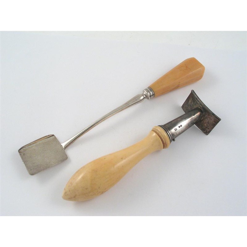A George III ivory handled stilton scoop, by Messrs Eley, Fearn & Chawner, London 1811 and a Victorian mounted ivory handle (only) by CT & G Fox. (2)