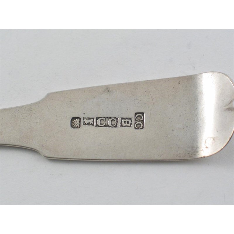 A 19th century fiddle basting spoon, struck with the following marks (fan, lion, CC, crown, CC), unascribed, probably Colonial 1st half of the 19th century, 3oz.