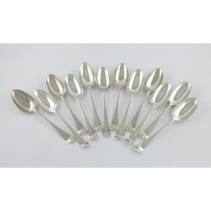 A collection of twelve 18th century silver Hanoverian pattern tablespoons