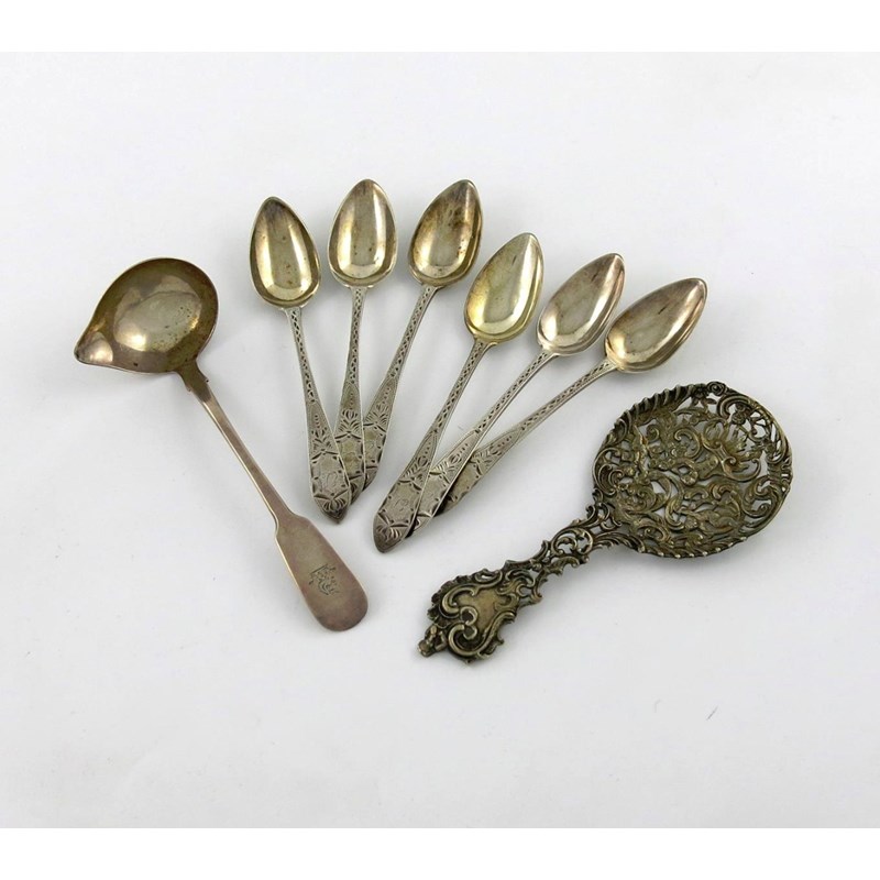 comprising: a set of six George III Scottish silver Celtic Point teaspoons, by W. P. Cunningham, with later engraved decoration, plus a pierced spoon, by William Comyns, London 1895, and an Irish Fiddle pattern toddy ladle with a lip, Dublin 1834, approx. weight 4.8oz. (8)