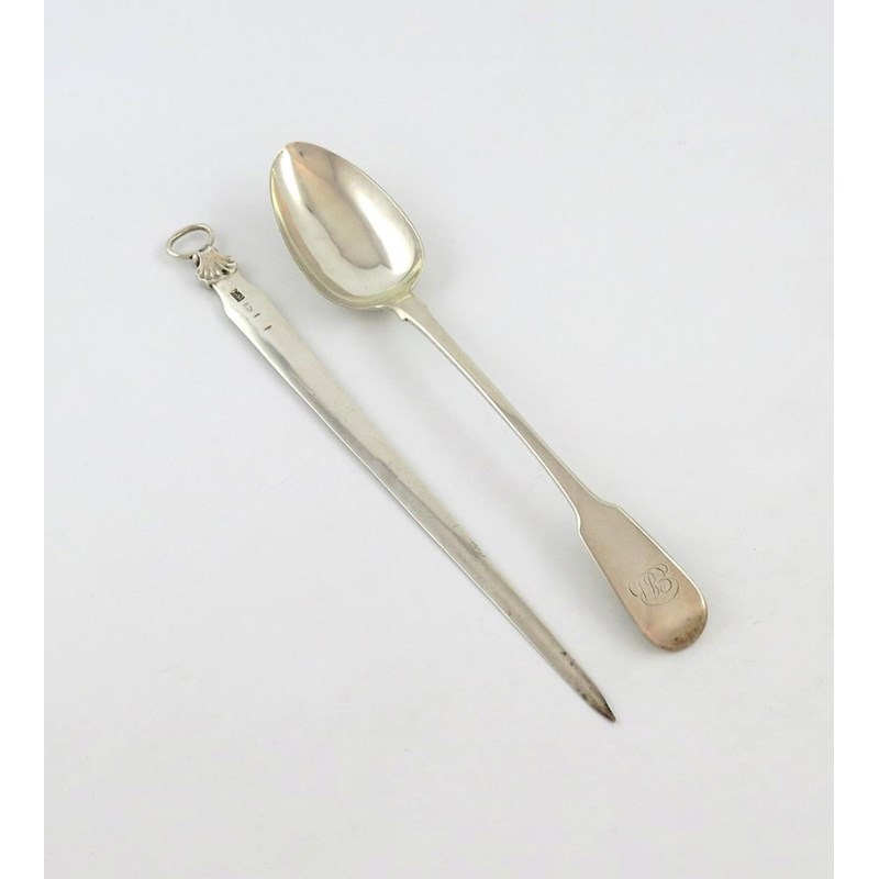tapering form, with a shell mounted ring handle, plus a George IV silver Fiddle pattern basting spoon, by George Piercy, London 1824, the terminal with a monogram, approx. total weight 6.5oz. (2)