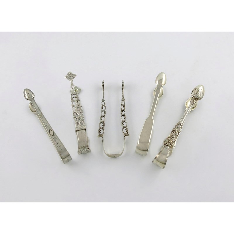 A small collection of five pairs of antique silver sugar tongs